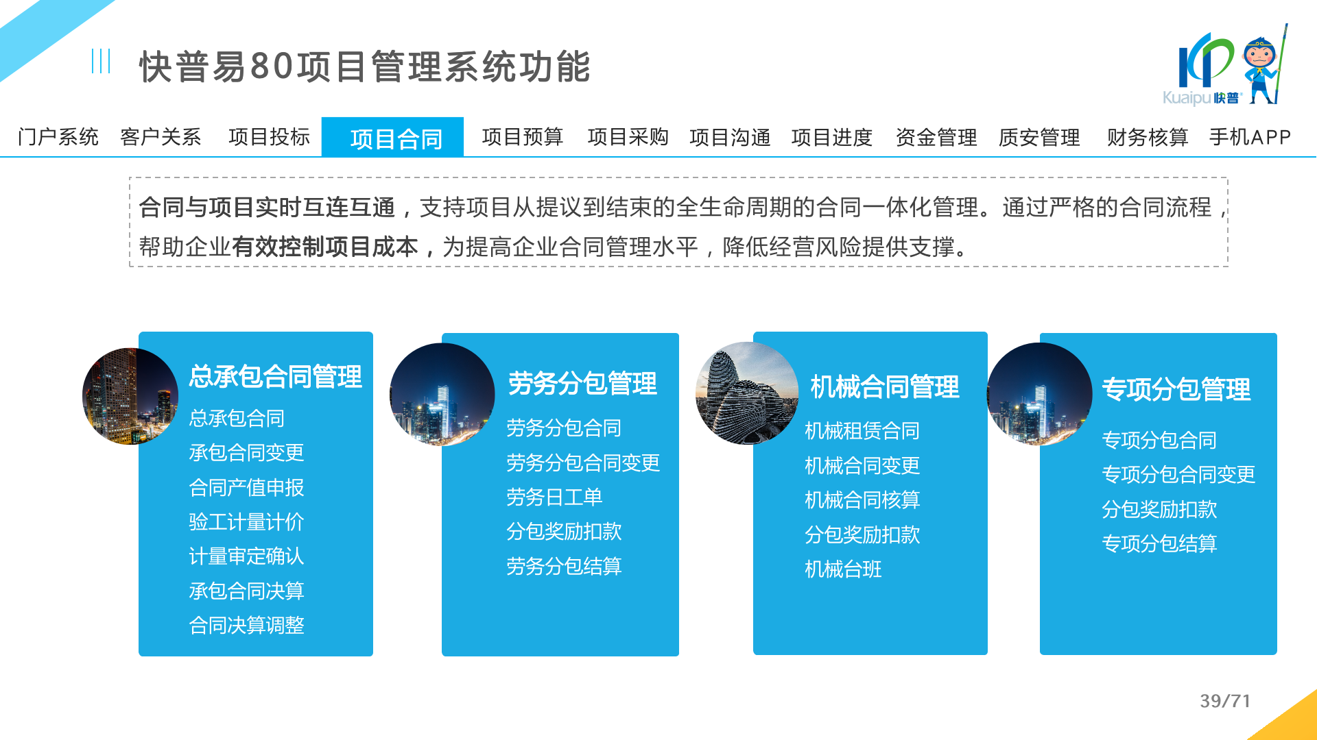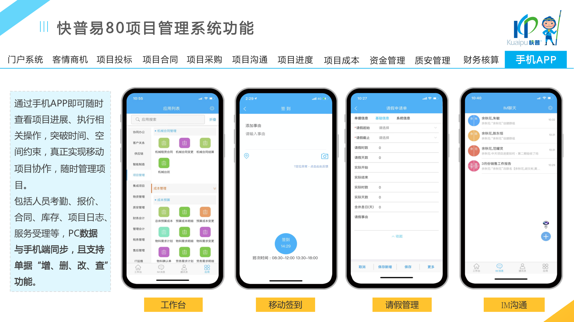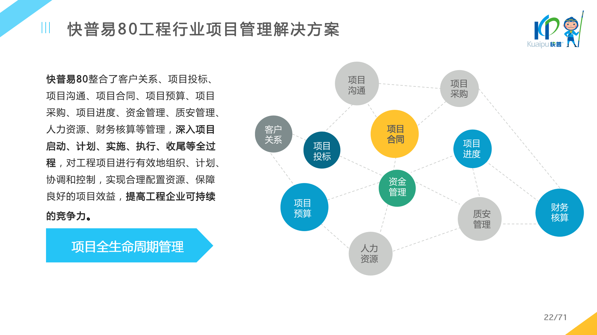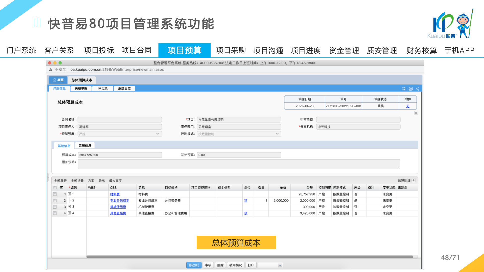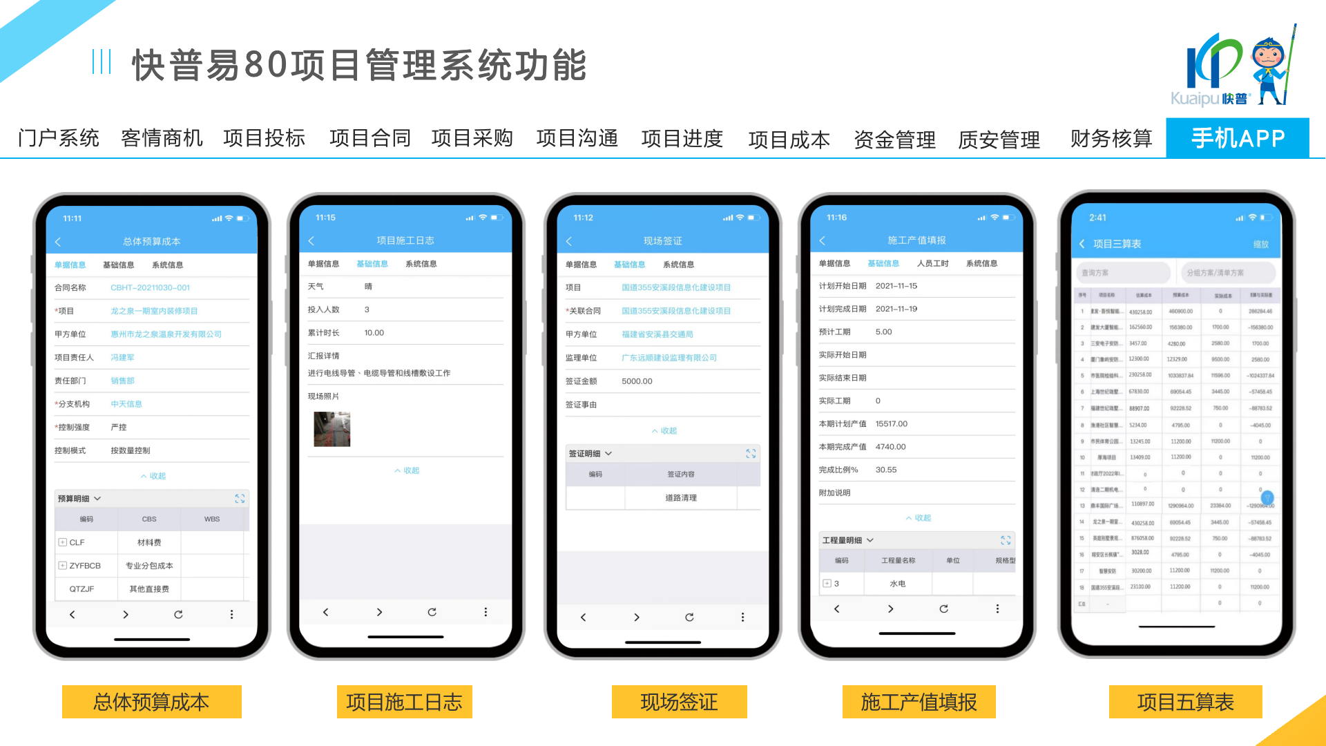 快普易80以項(xiàng)目管理為核心,通過“四控、四管、一協(xié)調(diào)”方式,對(duì)項(xiàng)目進(jìn)度、成本、資金、質(zhì)量安全進(jìn)行全面控制,實(shí)現(xiàn)投標(biāo)管理、合同管理、物資管理、預(yù)算管理等項(xiàng)目全生命周期項(xiàng)目的數(shù)字化管理,實(shí)現(xiàn)資源合理配置、保障良好的項(xiàng)目效益。