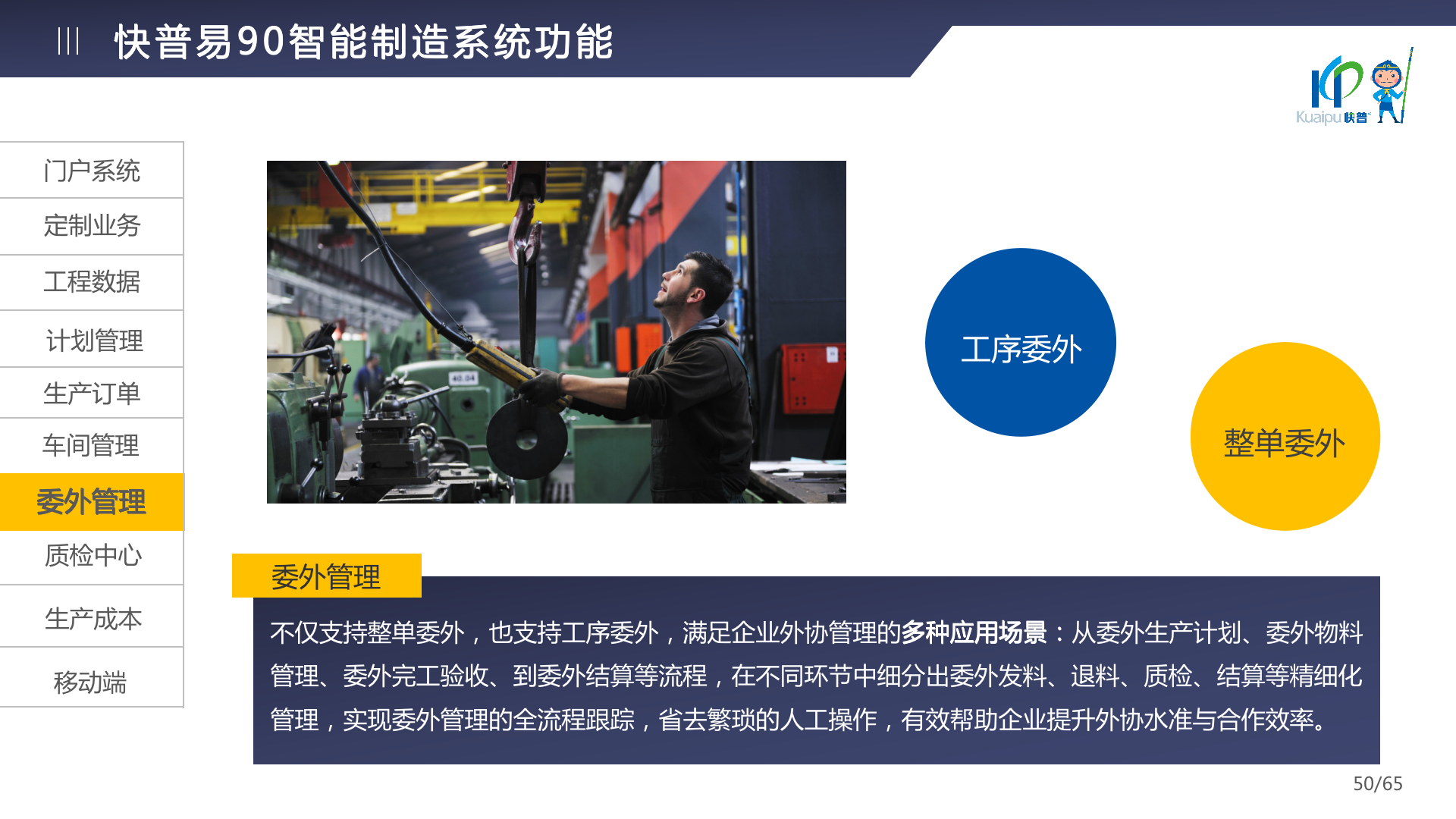 快普易90融合了大量精益生產(chǎn)管理的經(jīng)驗,涵蓋計劃管理、BOM管理、MRP運算、生產(chǎn)訂單管理、供應(yīng)鏈管理、車間管理、出入庫管理、委外管理、質(zhì)量管理、生產(chǎn)成本核算、報表分析等全面生產(chǎn)管理,為企業(yè)打造實時感知變化、分析變化、提供決策的數(shù)字化管理平臺,推動企業(yè)創(chuàng)新的管理,實現(xiàn)“智能制造”的數(shù)字化轉(zhuǎn)型。