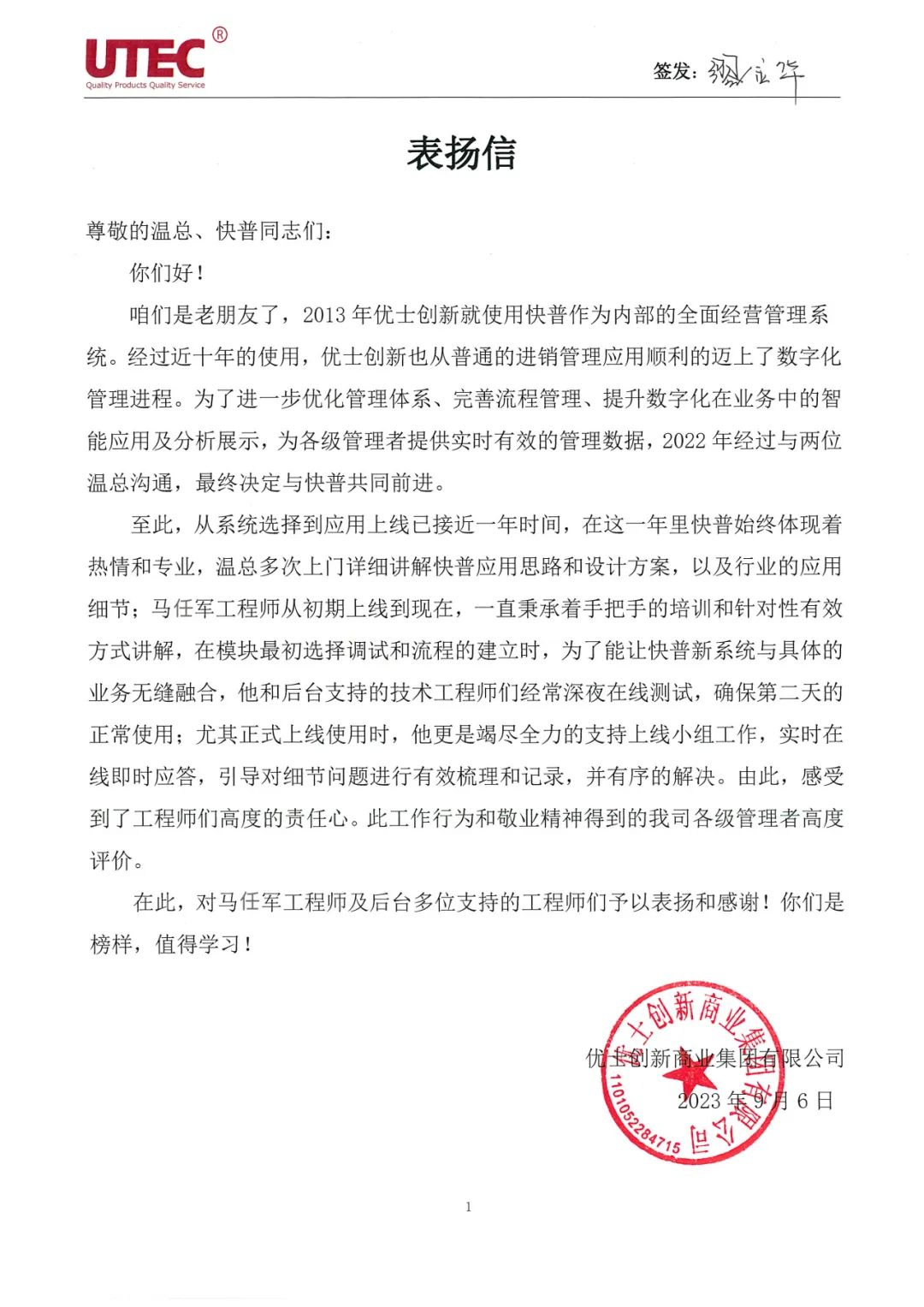 【簡訊】老客戶優(yōu)士創(chuàng)新商業(yè)集團(tuán)有限公司(以下簡稱“優(yōu)士創(chuàng)新”)向我司發(fā)來感謝信,對快普的平臺、產(chǎn)品和團(tuán)隊服務(wù)給予了高度肯定,并特別對實(shí)施工程師馬任軍的專業(yè)、敬業(yè)及高度責(zé)心提出了表揚(yáng)和贊賞。