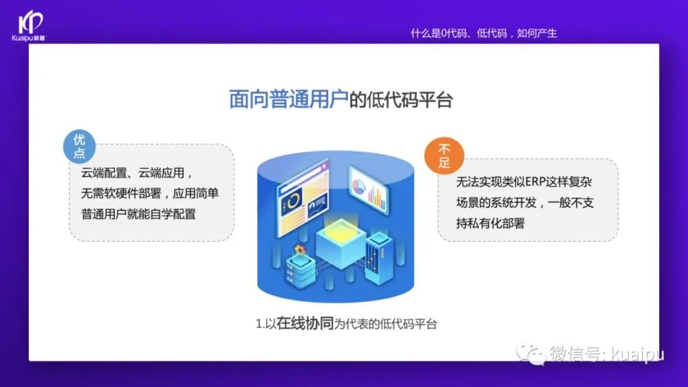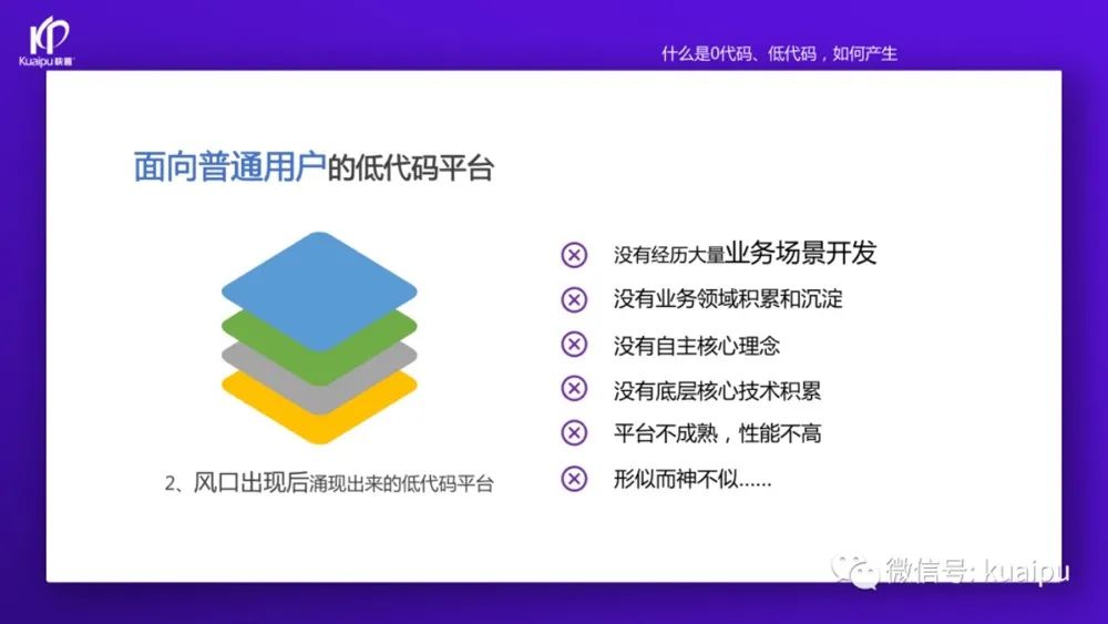 “這兩年快普已經(jīng)成功轉(zhuǎn)型為數(shù)字化平臺(tái)服務(wù)商,為客戶提供開發(fā)平臺(tái)和解決方案(產(chǎn)品)等服務(wù)。我們先從開發(fā)平臺(tái)說起,目前市場(chǎng)上的零代碼、低代碼平臺(tái)大致可以分為這幾類: