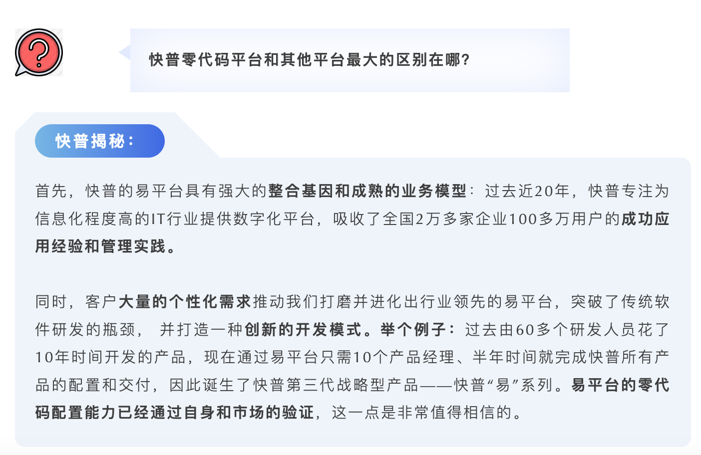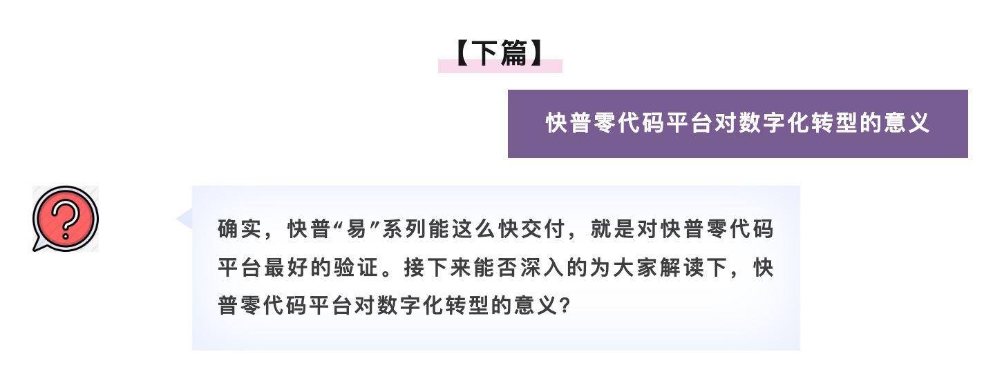 是的,我們可以很自信地說“快普零代碼平臺(tái)讓數(shù)字化轉(zhuǎn)型變得簡(jiǎn)單、可行”。這個(gè)是面對(duì)數(shù)字化轉(zhuǎn)型的所有角色而言的,包括我們自身軟件研發(fā)、實(shí)施交付,以及合作伙伴、用戶等,易平臺(tái)在效率、成本、技術(shù)門檻和可擴(kuò)展性等方面來說都有著顛覆性的突破,是非常有意義和必要的基礎(chǔ)設(shè)施??偨Y(jié)說有下面幾點(diǎn):