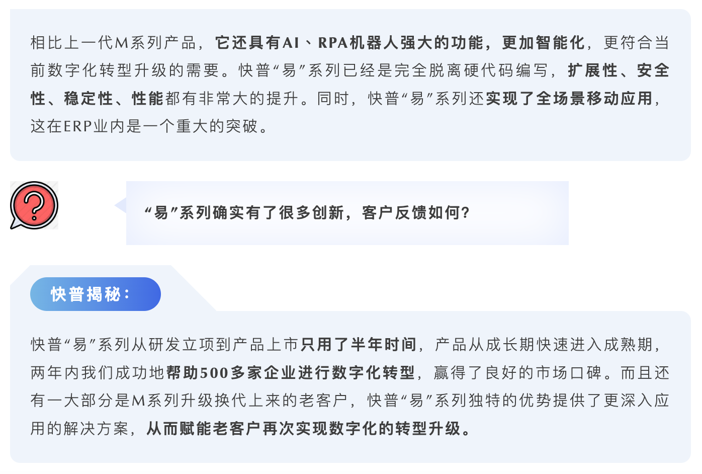 傳統(tǒng)的軟件開發(fā)需要很多經(jīng)驗(yàn)豐富的編程人員,每個(gè)人的技術(shù)水平、寫法各不同,而易平臺(tái)可大大減少因人為編碼錯(cuò)誤而引起的bug。平臺(tái)所有配置邏輯都是“開源”可視的,所有人員都看得懂產(chǎn)品的配置信息,問題定位也更快更準(zhǔn)確。此外,平臺(tái)還支持按明細(xì)生成升級(jí)腳本,bug修復(fù)和需求交付更高效。隨時(shí)能調(diào)整、發(fā)布、更新,也使得產(chǎn)品維護(hù)和升級(jí)更便捷,這些優(yōu)勢(shì)都進(jìn)一步加強(qiáng)了產(chǎn)品的穩(wěn)定可靠。