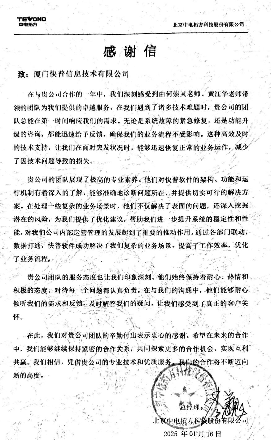 【快普簡訊】 北京中電拓方科技股份有限公司向我司發(fā)來感謝信,對何崇靈老師、黃江華老師帶領(lǐng)的實(shí)施小組在過去一年中提供的優(yōu)質(zhì)服務(wù)表示高度認(rèn)可和衷心感謝。來信不僅是對快普實(shí)施團(tuán)隊(duì)專業(yè)能力的肯定,更是對快普“客戶至上”服務(wù)理念的詮釋。