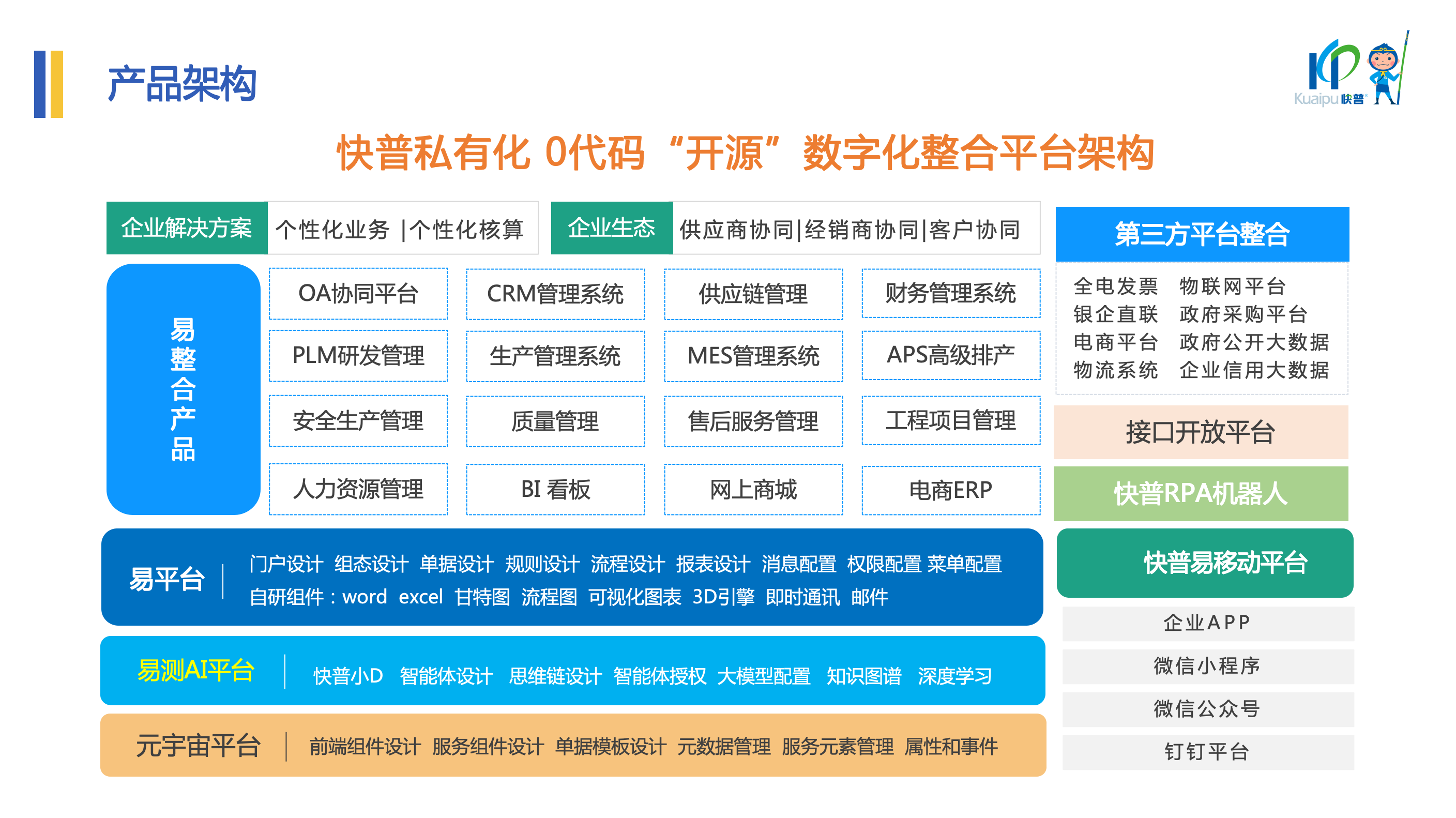 針對(duì)企業(yè)普遍面臨的“信息孤島”難題——系統(tǒng)林立、數(shù)據(jù)不通、業(yè)務(wù)流程斷點(diǎn)卡點(diǎn)眾多,導(dǎo)致內(nèi)部協(xié)同低效、管理成本高昂等問題,溫董指出:“系統(tǒng)整合是提質(zhì)增效最有效的手段,碎片化的系統(tǒng)建設(shè)模式已成為制約企業(yè)全局效率的罪魁禍?zhǔn)住!?br> 快普以“整合管理”為核心的數(shù)字化轉(zhuǎn)型理念,通過“一個(gè)平臺(tái)”覆蓋企業(yè)全鏈條管理,包括PLM研發(fā)管理、APS高級(jí)排產(chǎn)、MES車間執(zhí)行、供應(yīng)鏈協(xié)同、集團(tuán)化財(cái)務(wù)核算等。